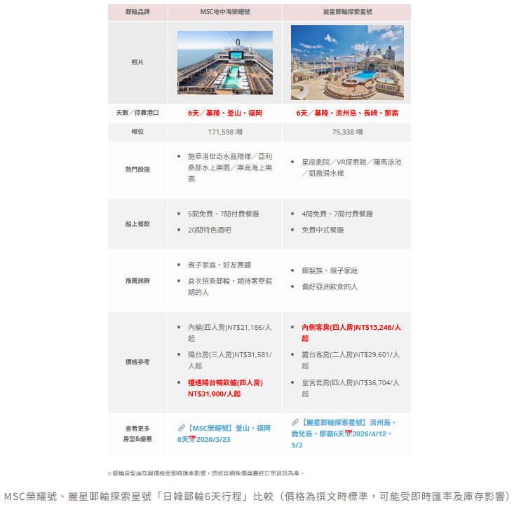 - 🔥立即預訂 熱門郵輪行程👉2026【MSC 地中海郵輪榮耀號】那霸 4 天📅6/18、7/9、7/22